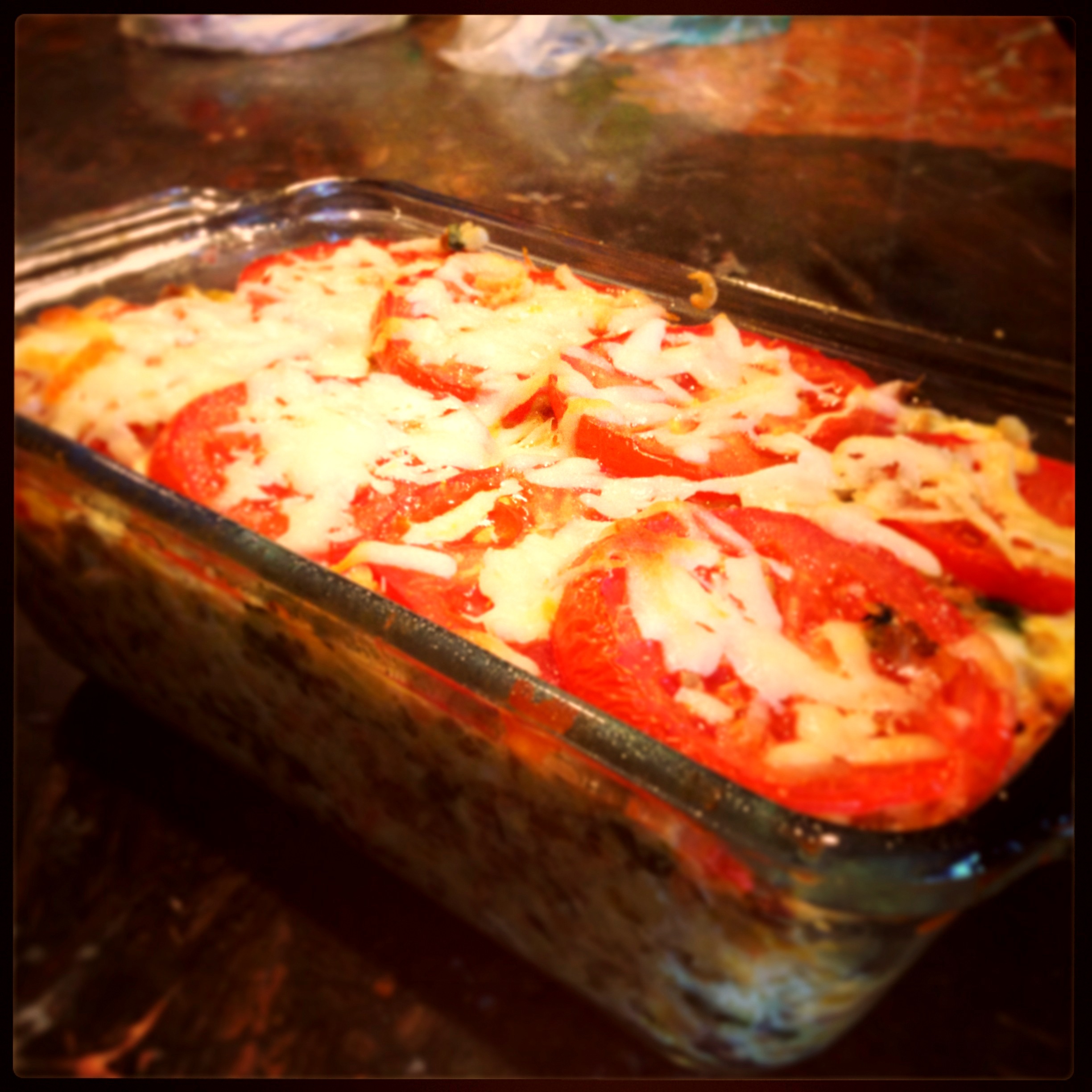 Add the lentils, cooked brown rice, ¾ cup of the mozzarella, the corn, basil, beaten eggs, salt, pepper, and 3/4 cup of the sauce to the cooled onion mixture. Spoon the mixture into the prepared pan. Arrange the sliced tomatoes in 2 rows over the lentil mixture, covering the top completely. Sprinkle with the remaining ¼ cup mozzarella and drizzle with the remaining 1 tablespoon olive oil.