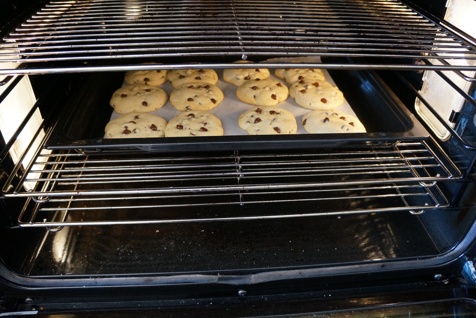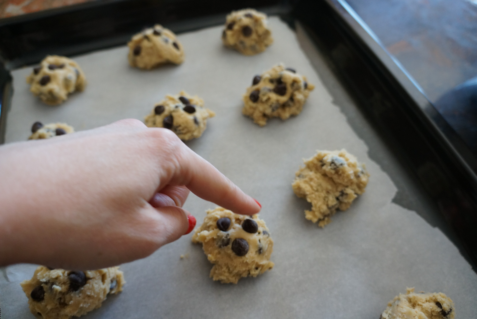 So, when my next batch went in, I added the extra chips while cooking, mid-way. I pulled out the oven shelf and lightly pressed them on and VOILA! more professional looking chocolate-chip cookies!